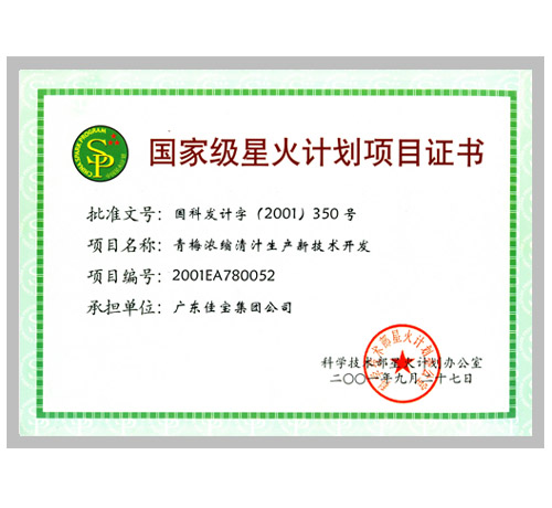 2001年 青梅濃縮汁 科技部星火計(jì)劃辦公室