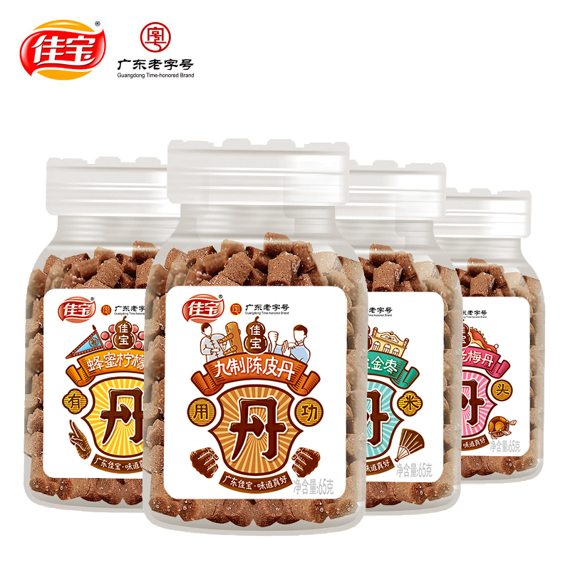 佳寶九制陳皮丹 2019-04-10 九制陳皮丹原料是陳皮、山楂,并且陳皮、山楂含量高達80%,再加上不同口味的果肉。成分健康且熱量低!品嘗起來酸酸甜甜、口味甘涼。四種口味:九制陳皮丹,蜂蜜老梅丹,蜂蜜檸檬丹,金桔鹽金棗。